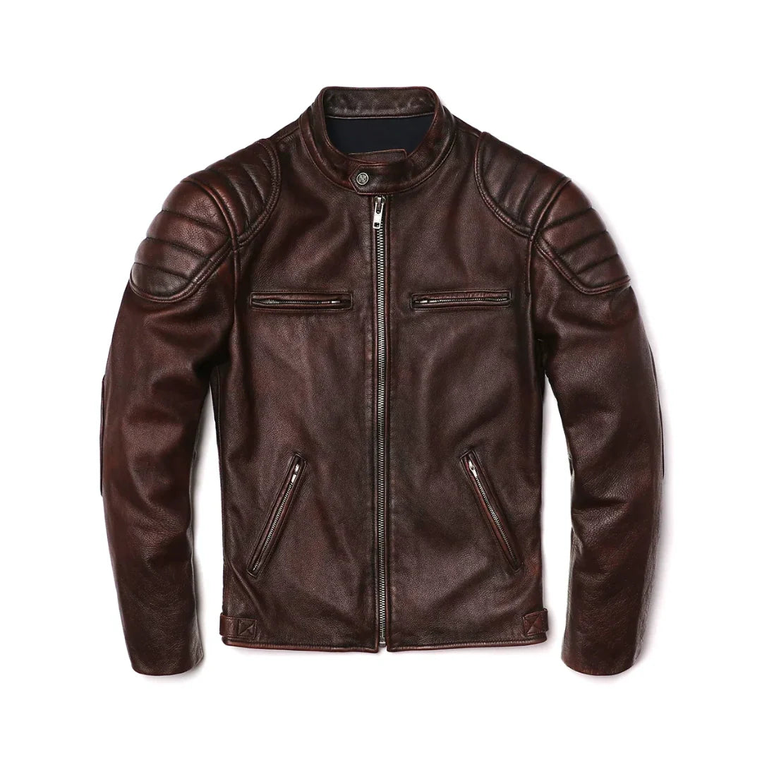 Men’s Brown Distressed Café Racer Motorcycle Jacket — Real Leather with Straight Collar
